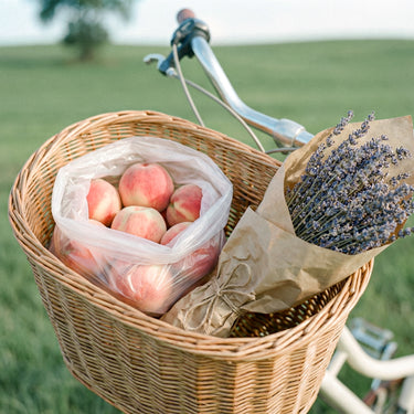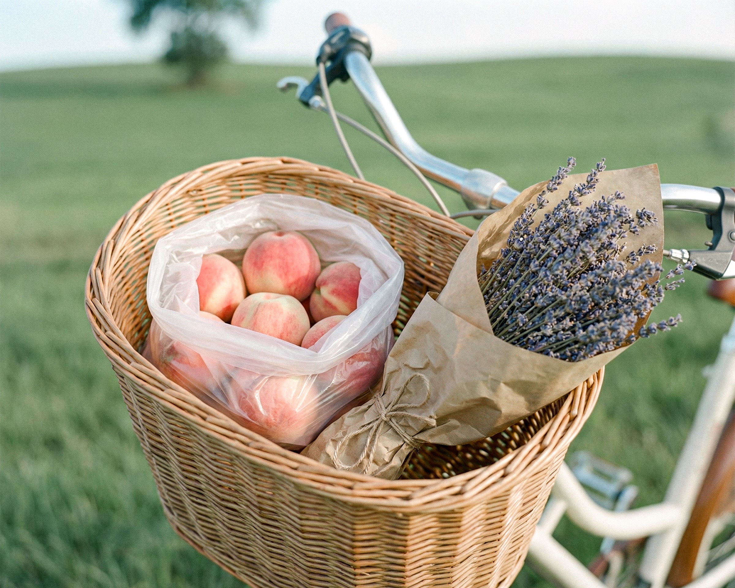 On a warm, sunny spring day, a gentle breeze blows through the park as I cycle. I pause on a bench and sip a refreshing peach drink, quenching my thirst. The fresh scent of peach mingles with the sweetness of purple flowers and fruits like lavender and blueberries.